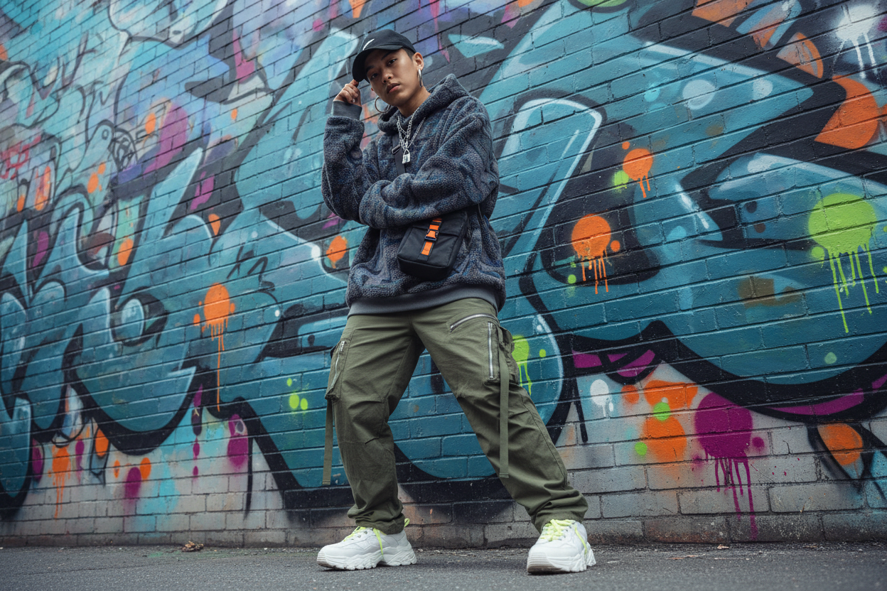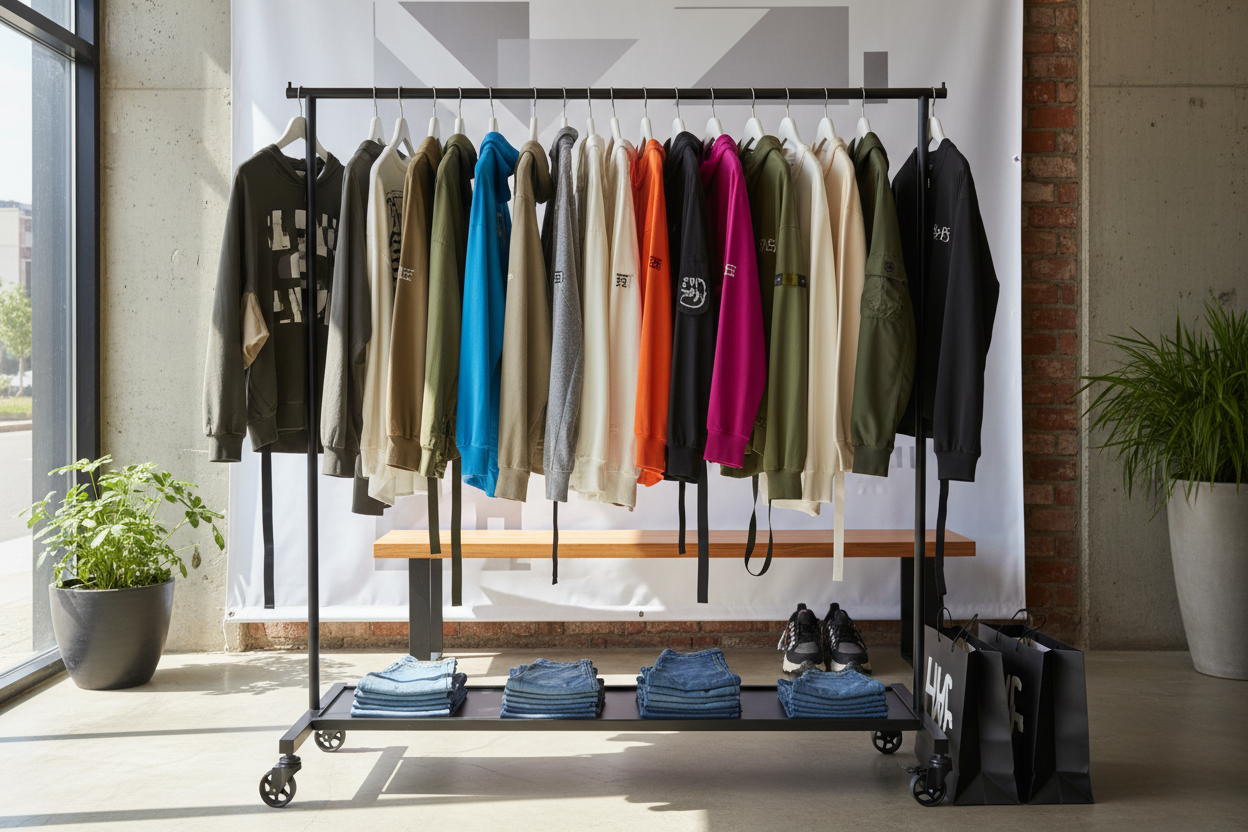 maak een afbeelding van een fashion pop up algemeen kleding rek met streetwear vibes